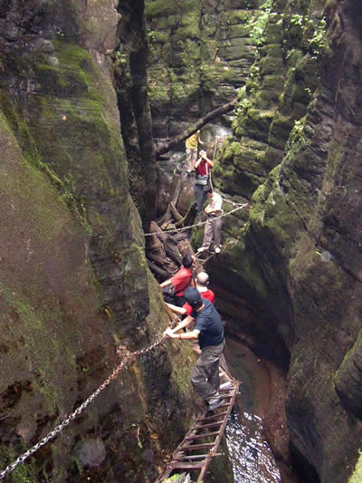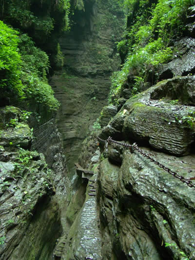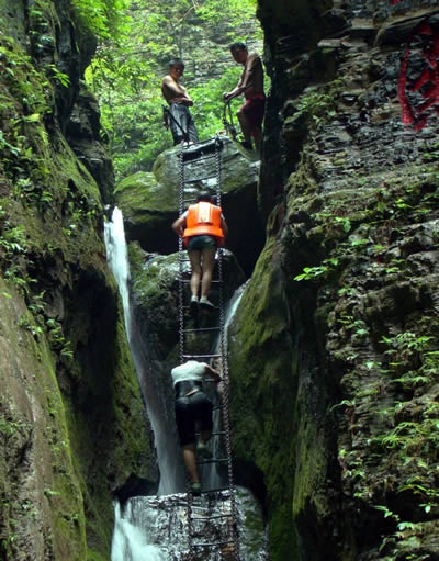 坐龍峽擁有中國第一條特種游道。所有游道均建于峽谷深處,依山取勢,既經(jīng)細心雕琢聽卻又渾然天成。粗樸的板栗木棧道,可以讓你零距離的親近那一潭碧幽、聽聞山泉叮咚;精巧的跳墩,可以讓你媳戲流泉、觸感溪瀑;原質(zhì)的石坎道,讓你不得不調(diào)動全部的身心能量悉心攀援、感悟峽谷;有驚無險的鐵梯,讓你伴著腳下轟鳴的溪水,在驚怵中體味一份快慰。出口處的土家山寨,保留了古樸獨特的生活習(xí)俗。一塊臘肉就一口醇香的“苞谷燒”會讓你洗去所有的疲憊,在輕松中憨厚的主人向你講述過去強人出沒的故事......