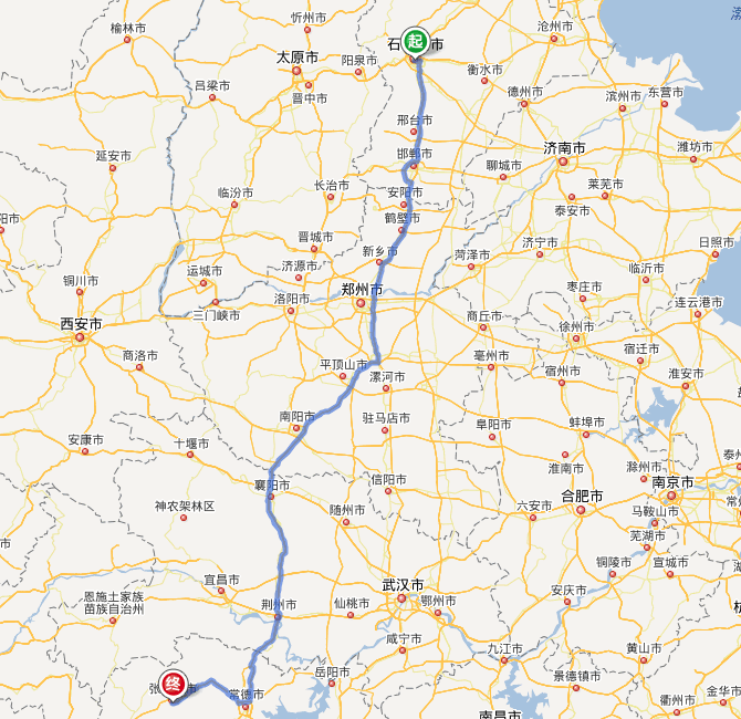 左右,沿途經過石家莊——邢臺——邯鄲——安陽——鶴壁——新鄉(xiāng)——鄭州——許昌——平頂山——南陽——襄陽——荊門——荊州——澧縣——石門縣——慈利縣——張家界。