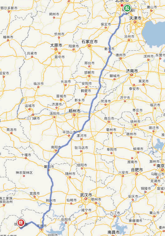 左右,沿途經過廊坊——衡水——濮陽——許昌——平頂山——南陽——襄陽——荊門——荊州——石門縣——慈利——張家界。