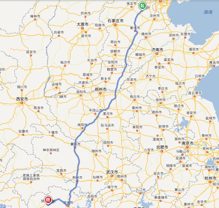 左右,沿途經過任丘——衡水——濮陽——許昌——平頂山——南陽——襄陽——荊門——荊州——常德(也可以走國道經澧縣、石門縣)——慈利——張家界。
