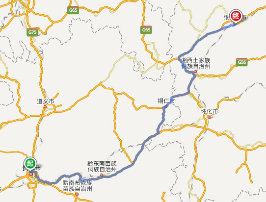 左右,沿途經過貴陽——貴定縣——麻江縣——凱里市——臺江縣——劍河縣——玉屏侗族自治縣——銅仁——鳳凰古城——吉首市——花垣縣——保靖縣——張家界市。