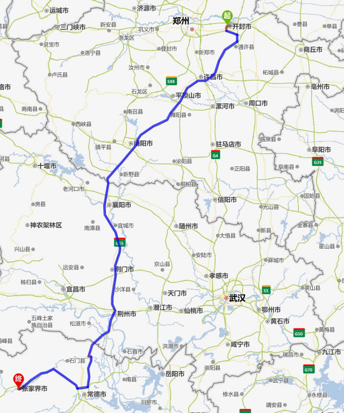 開(kāi)封去張家界自駕車自助游線路圖全程高速):