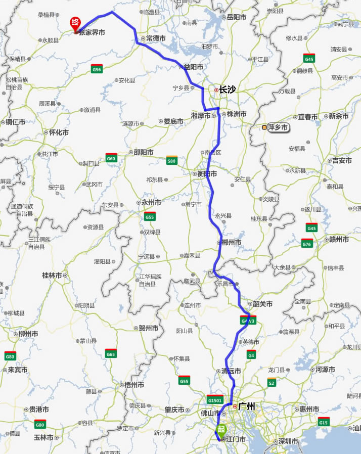 江門(mén)去張家界自駕車(chē)自助游線路圖全程高速):