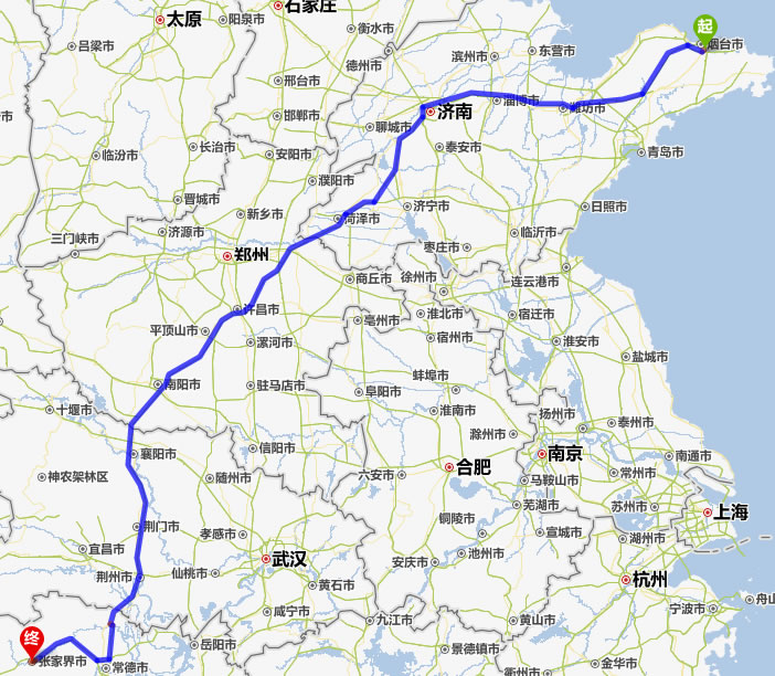 煙臺去張家界自駕車自助游線路圖全程高速):