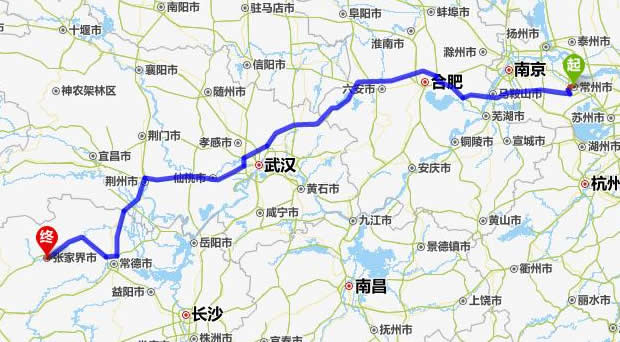 左右,沿途經過常州市——馬鞍山市——合肥——六安市——麻城市——仙桃市——潛江市——荊州市——常德市(這里可以不走常德,直接從荊州經澧縣、石門縣到慈利縣)——慈利縣——張家界。