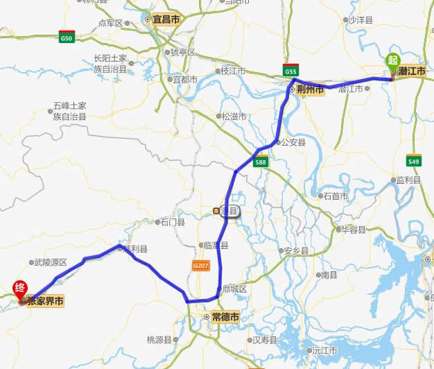 左右,沿途經過潛江市——潛江市——荊州市——公安縣——澧縣——常德(也可以走國道經澧縣、石門縣)——慈利——張家界。